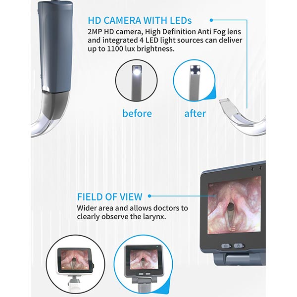 3. Laaja näkökenttä: Teimme tämän laryngoskoopin katselukulmasta mukavan ja leveän, jotta saat paljon suuremman ja selkeämmän näkymän. Lääkärit ja operaattorit näkevät kurkunpään rakenteen helposti, näkevät kaikki pienet anatomiset yksityiskohdat ja saavat toimenpiteitä tehdään nopeammin ja tarkemmin